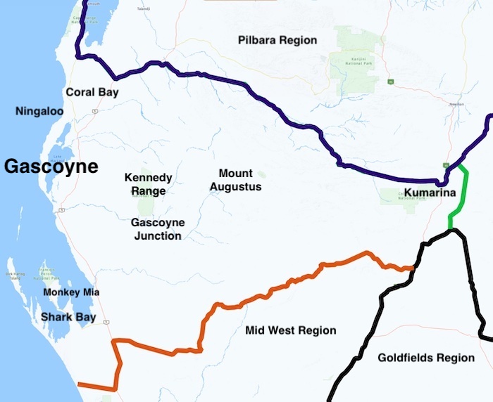 The northern boundary is from Exmouth to the North West Coastal Highway then eastward through pastoral country to just north of Kumarina Roadhouse on the Great Northern Highway.