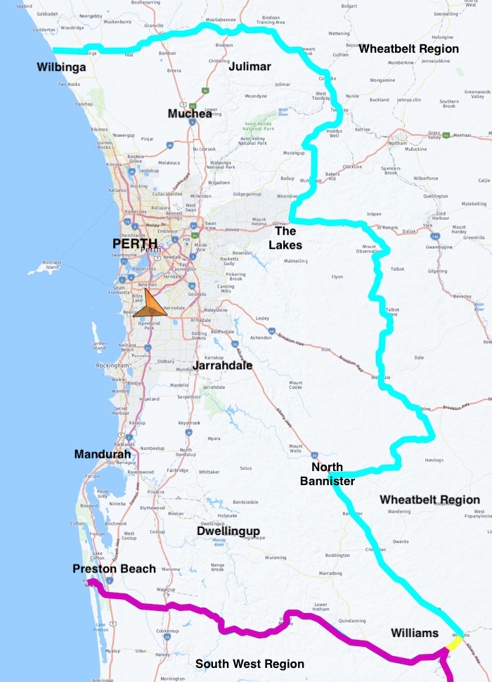 The Perth/Peel region is surrounded by the Wheatbelt to the north and east, and by the South West in the south.