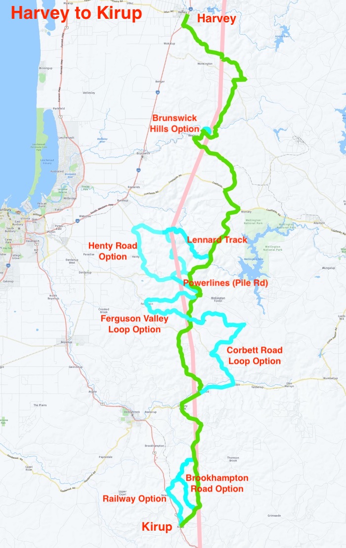 Next item on the menu is the well known Lennard Track, followed by a tour through the beautiful Ferguson Valley along Henty Road, returning to the line of the Scarp at Pile Road to tackle a short but interesting drive along some powerlines. The forest adventure continues with the Ferguson Valley Loop and the Corbett Road Loop.
