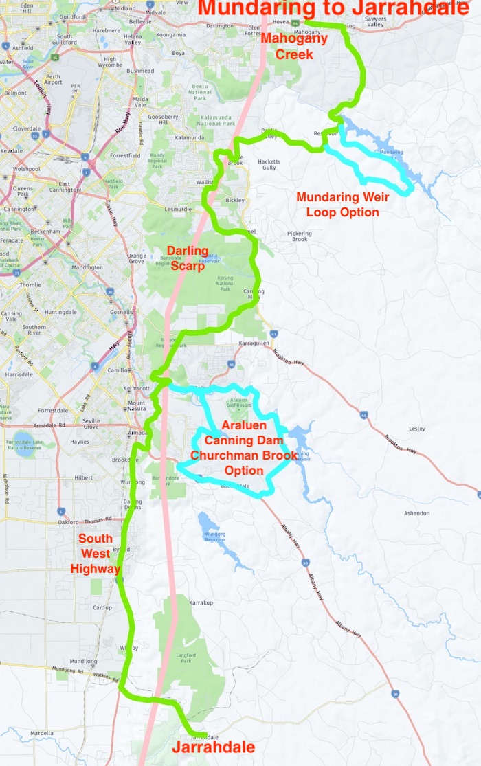 Near Mundaring the Route starts to align more closely with the Scarp. However, there are various Options that lead away from the line of the Scarp.